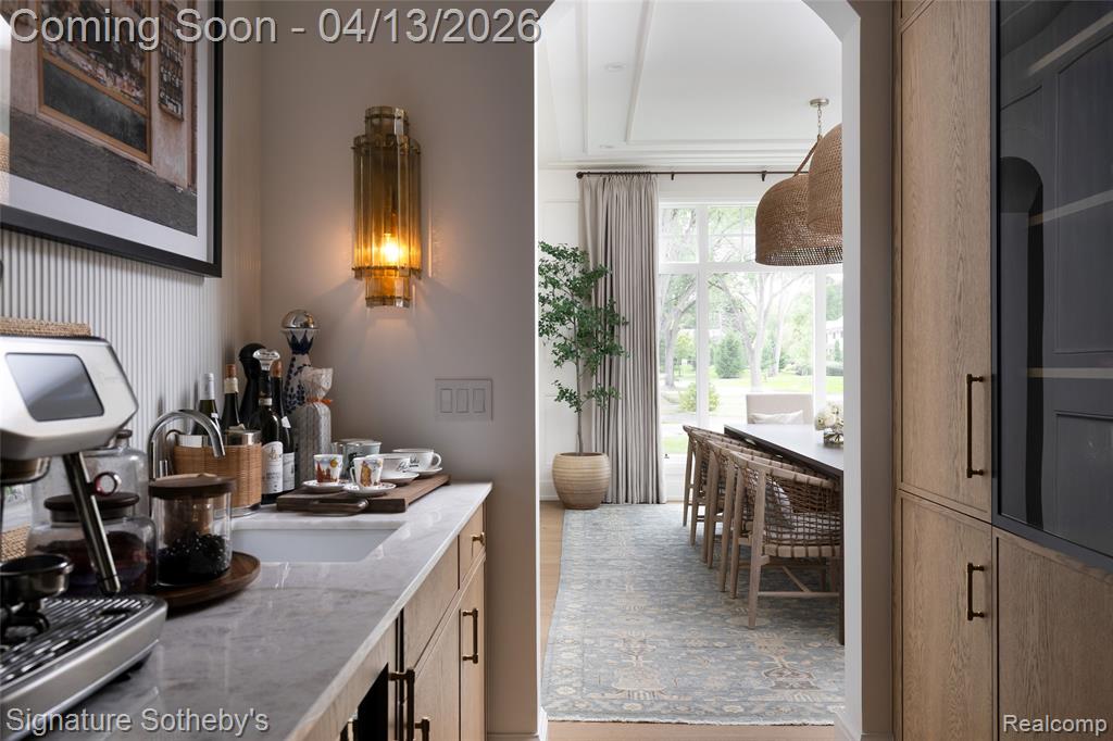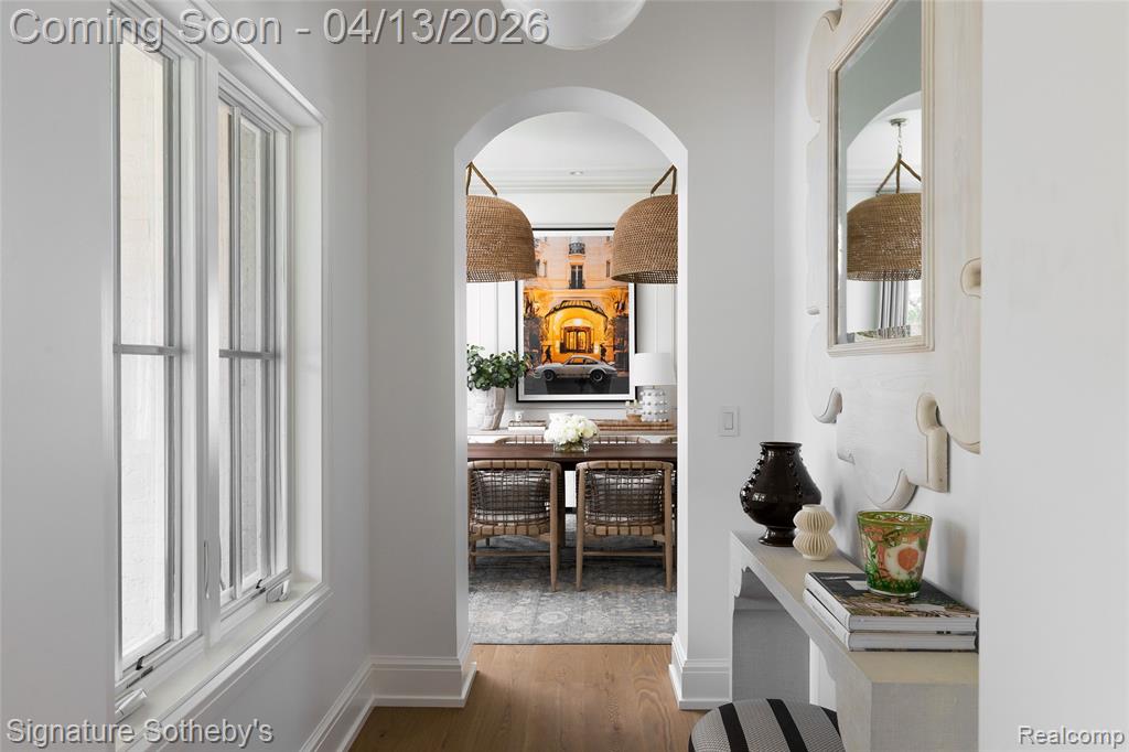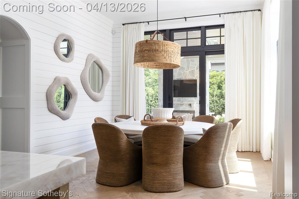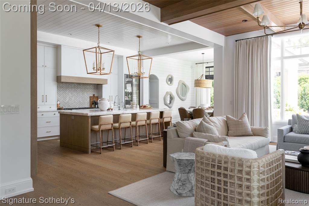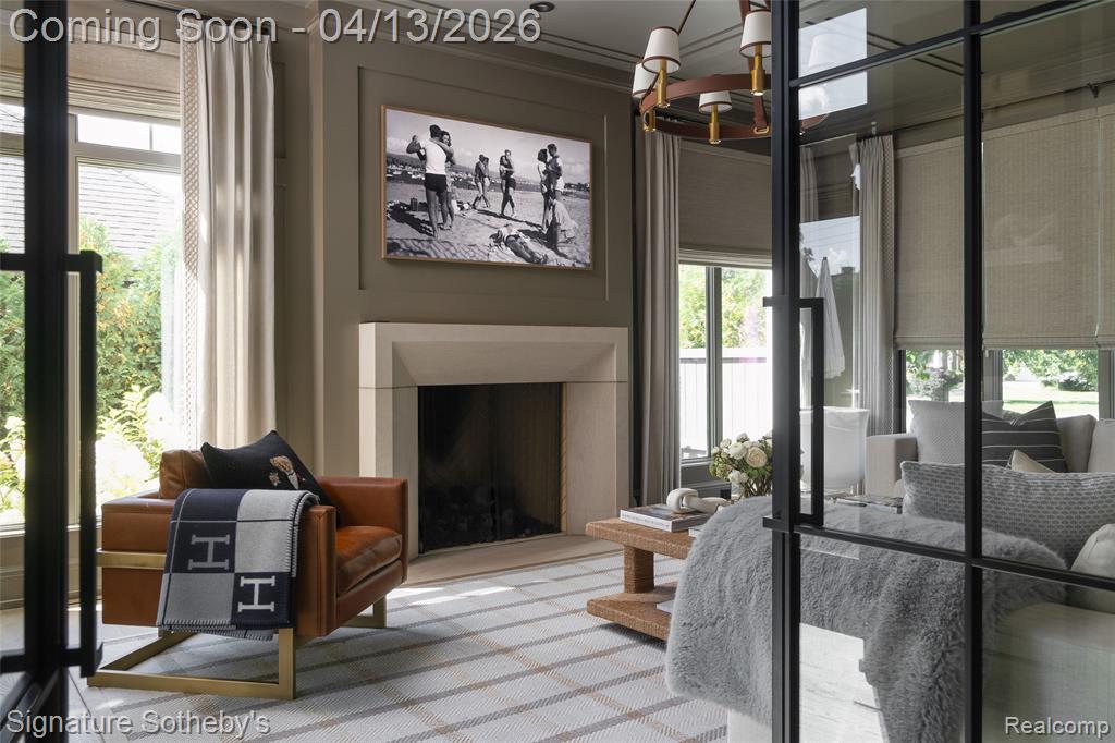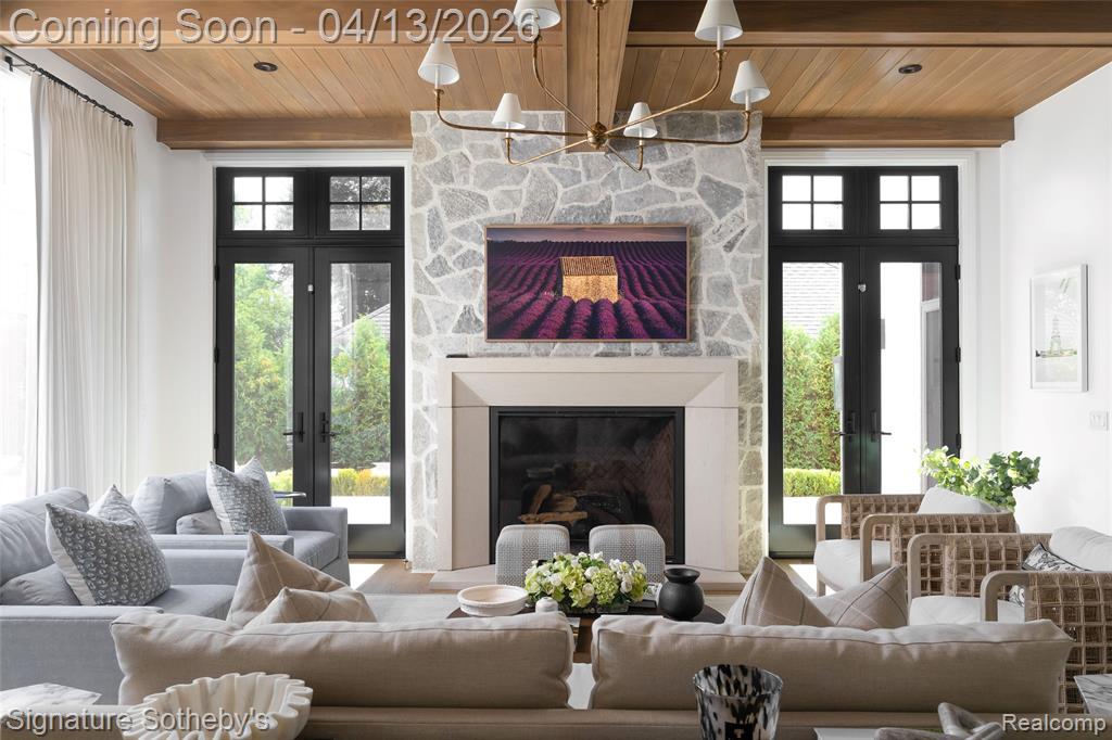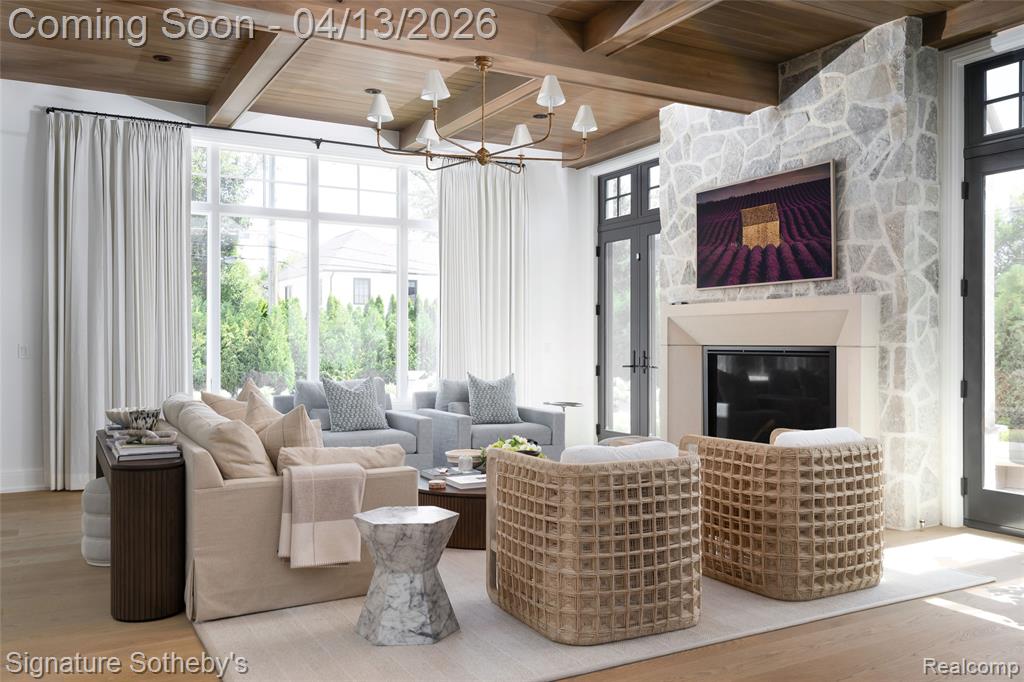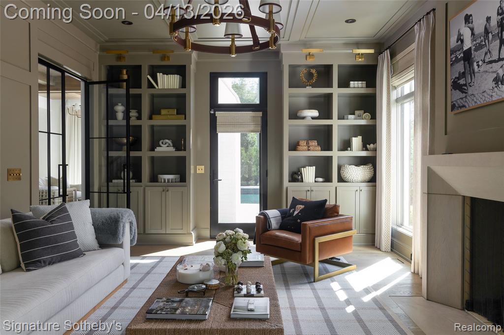 Built in 2023 by renowned builder Hunter Roberts, this 6-bedroom, 7.1-bath home spans over 8,000 square feet including the finished lower level, and was designed by award-winning architect Brian Neeper with interiors by Jessica Neeper. Featured in Twenty Magnificent Homes by Midwest Architects and recognized with multiple Detroit Design awards, the home reflects a balance of modern design and timeless craftsmanship, tailored for both everyday living and refined entertaining. A thoughtfully executed layout unfolds with intention, beginning with a distinctive circular entry that sets the tone for the home’s architectural flow. Expansive living spaces are defined by layered ceiling details, curated materials, and designer fixtures. The kitchen anchors the main level with quartzite surfaces, custom cabinetry, and premium appliances, seamlessly connected to the formal dining room through a butler’s hall. The living room is elevated by a striking stone fireplace with a full-height fieldstone chimney and wood-paneled coffered ceilings, while a detailed library offers a more intimate retreat.