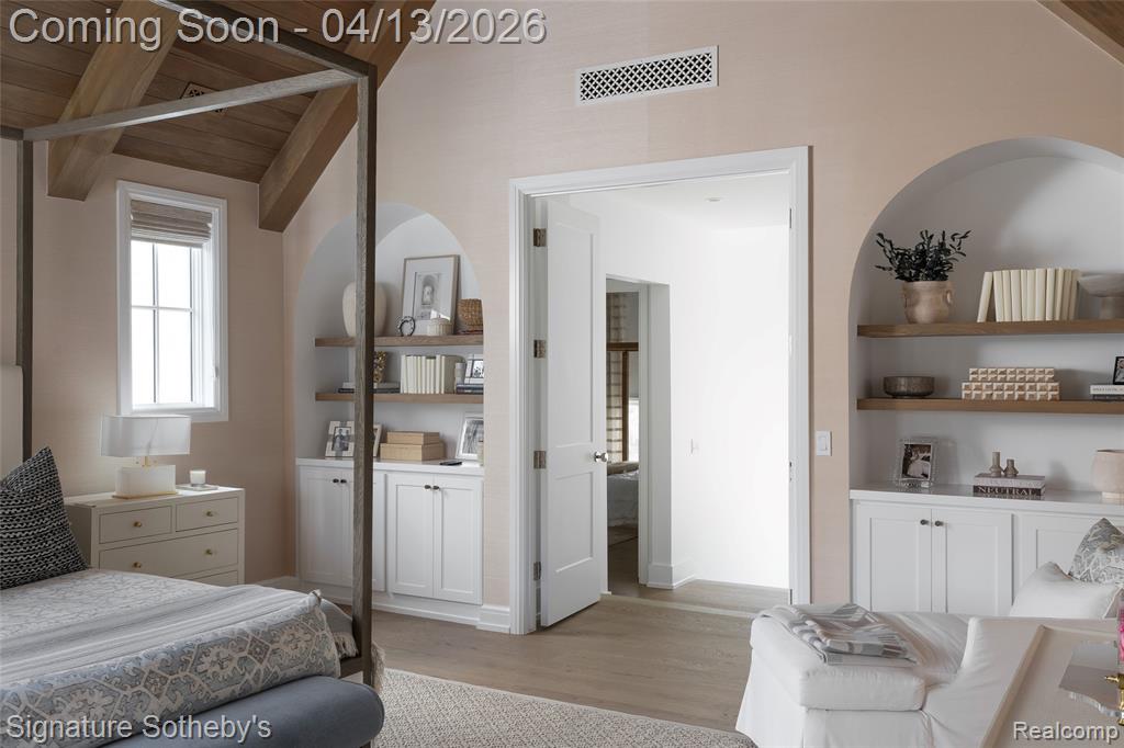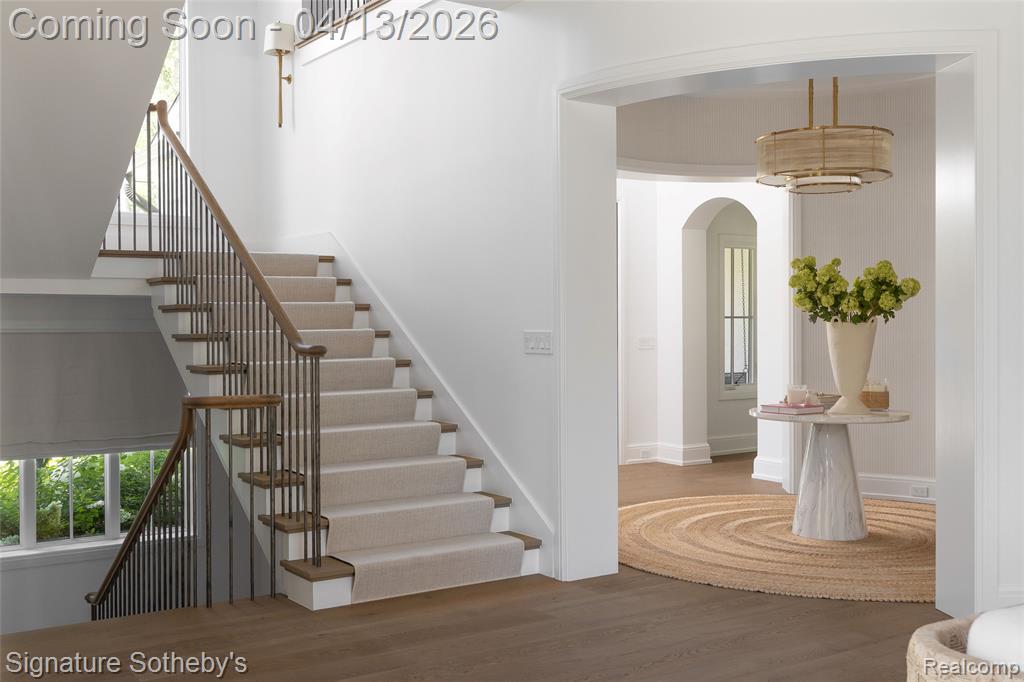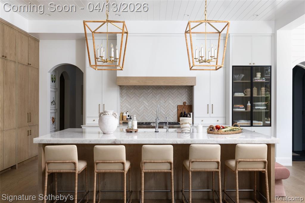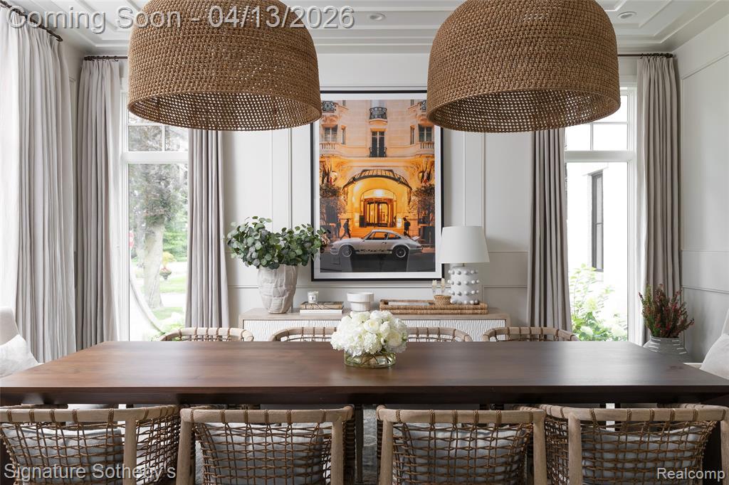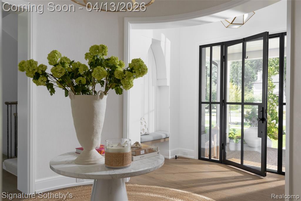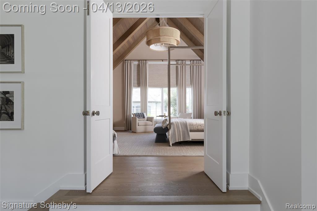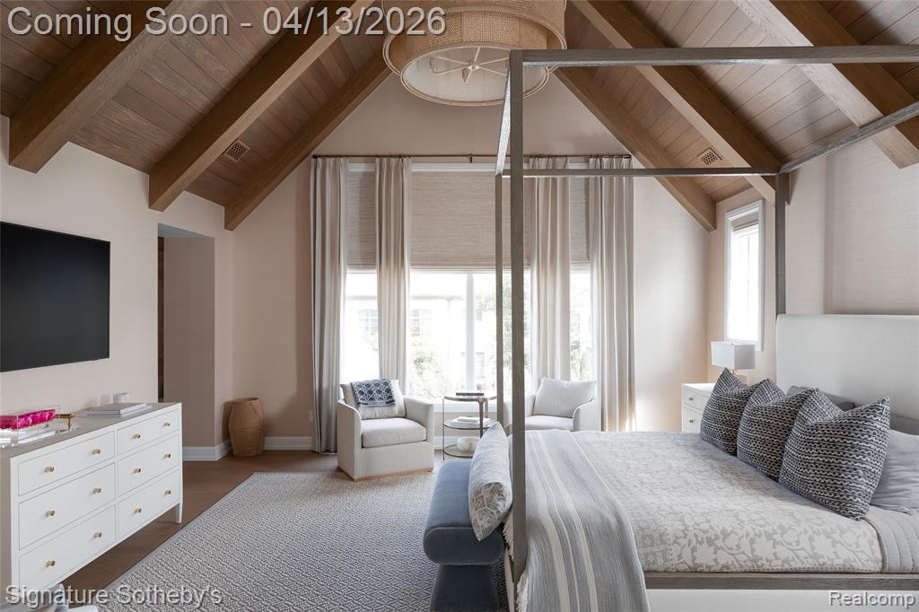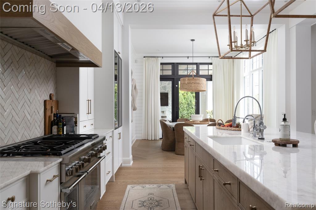 Built in 2023 by renowned builder Hunter Roberts, this 6-bedroom, 7.1-bath home spans over 8,000 square feet including the finished lower level, and was designed by award-winning architect Brian Neeper with interiors by Jessica Neeper. Featured in Twenty Magnificent Homes by Midwest Architects and recognized with multiple Detroit Design awards, the home reflects a balance of modern design and timeless craftsmanship, tailored for both everyday living and refined entertaining. A thoughtfully executed layout unfolds with intention, beginning with a distinctive circular entry that sets the tone for the home’s architectural flow. Expansive living spaces are defined by layered ceiling details, curated materials, and designer fixtures. The kitchen anchors the main level with quartzite surfaces, custom cabinetry, and premium appliances, seamlessly connected to the formal dining room through a butler’s hall. The living room is elevated by a striking stone fireplace with a full-height fieldstone chimney and wood-paneled coffered ceilings, while a detailed library offers a more intimate retreat.